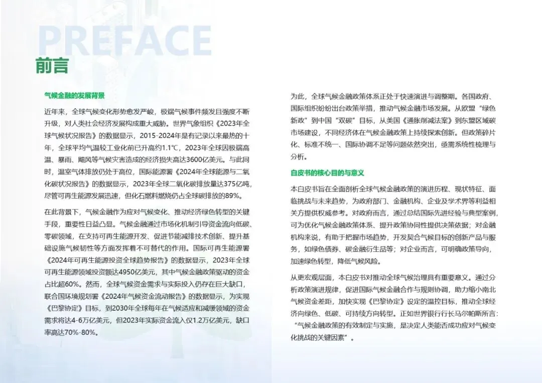它引导资本流向低碳领域,支撑可再生能源发展与气候韧性建设。本白皮书立足全球视野,系统梳理气候金融政策演进脉络,解析典型实践与创新路径。助力《巴黎协定》温控目标实现,让金融活水持续滋养绿色未来,共绘全球可持续发展新图景。