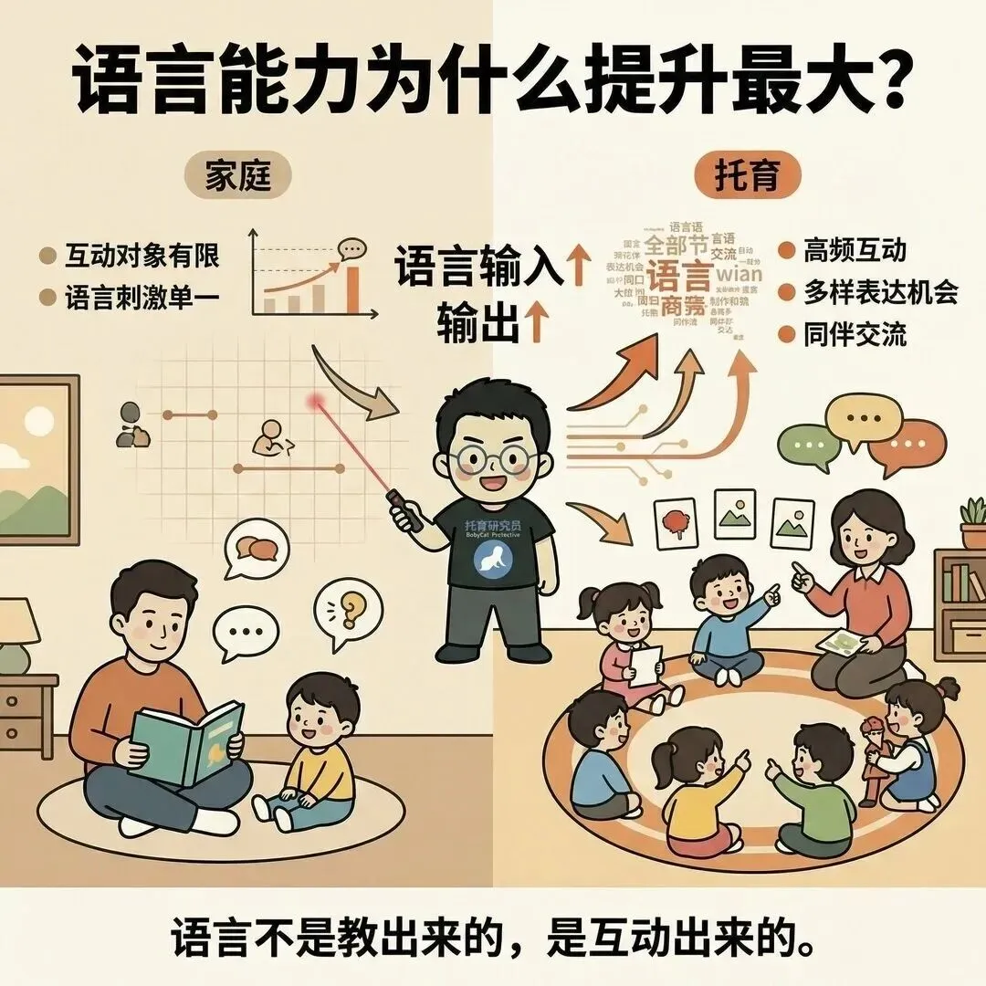 因为语言不是“教”出来的,而是“互动”出来的。托育环境提供了更高频的互动、更多样化的表达机会、更丰富的同伴交流场景,孩子的语言能力更容易被全方位“激活”。
