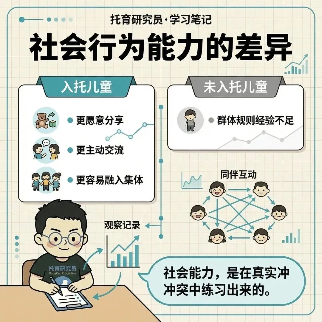 社会行为上:入托的孩子更愿意分享、更主动交流、更容易融入集体。
