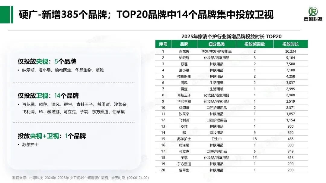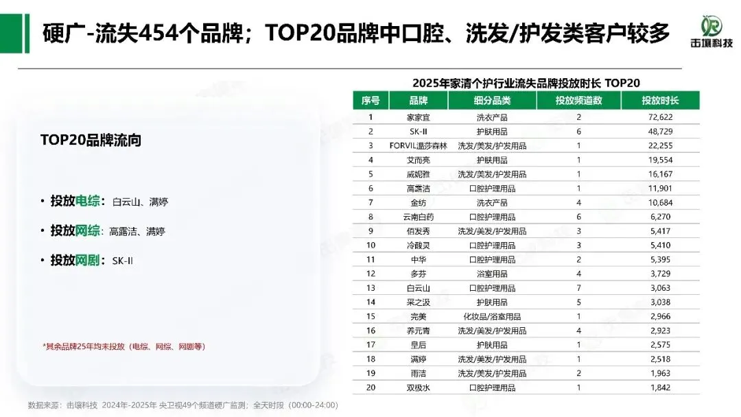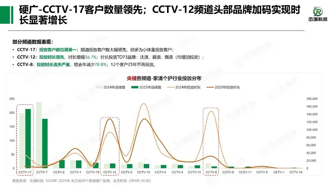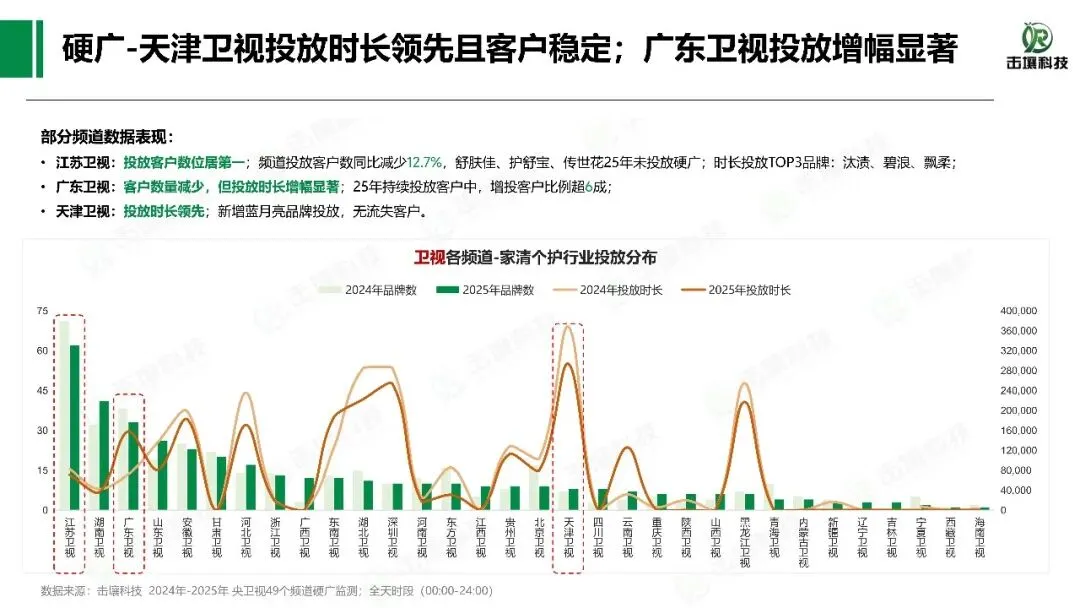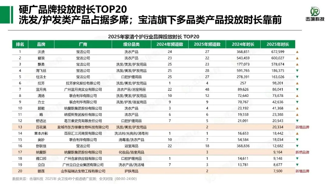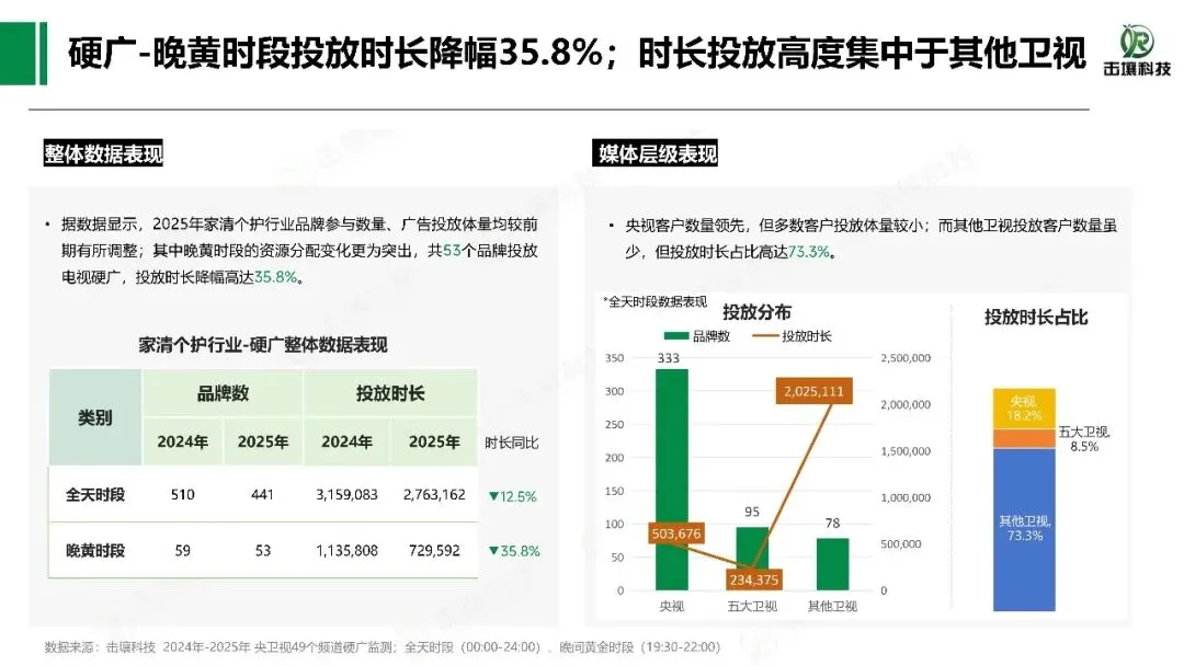据数据显示,2025年家清个护行业品牌参与数量、广告投放体量均较前期有所调整;其中晚黄时段的资源分配变化更为突出,共53个品牌投放电视硬广,投放时长降幅高达35.8%。