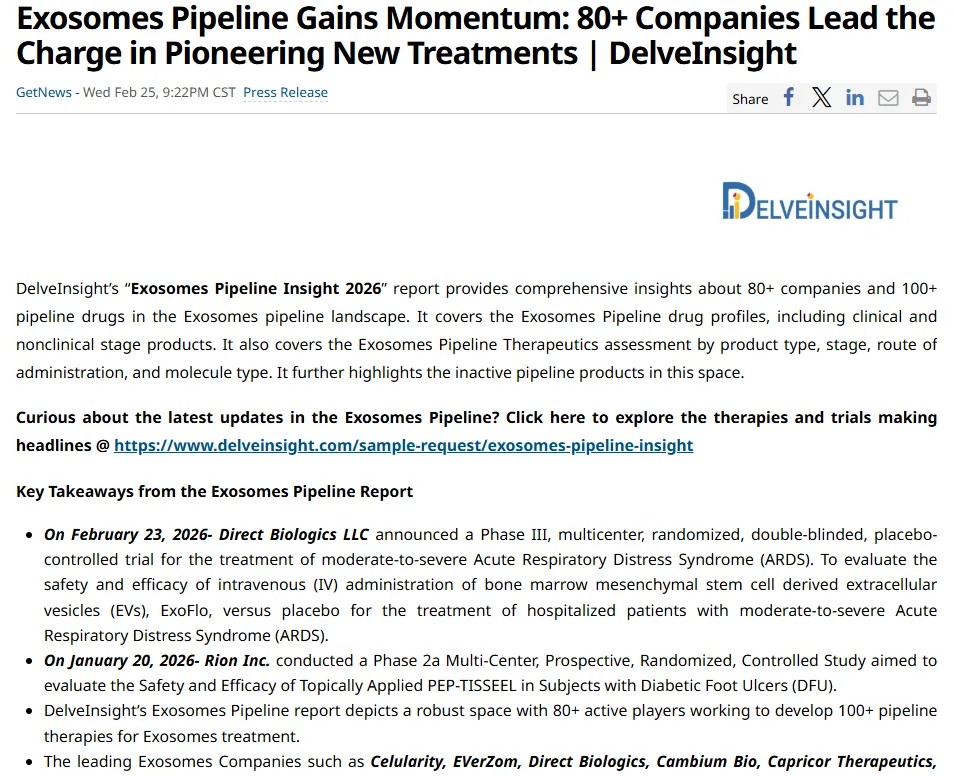 近日,国际财经资讯平台 StreetInsider 发布了 DelveInsight 的最新研究报告,直指外泌体赛道成为全球生物医药领域的核心创新高地:全球超 80 家企业集结发力,560 余种疗法在研,近千项人体试验推进,从肿瘤、神经退行性疾病到罕见病,外泌体正以 “下一代创新疗法” 的姿态,掀起全球研发与产业化的双重浪潮。