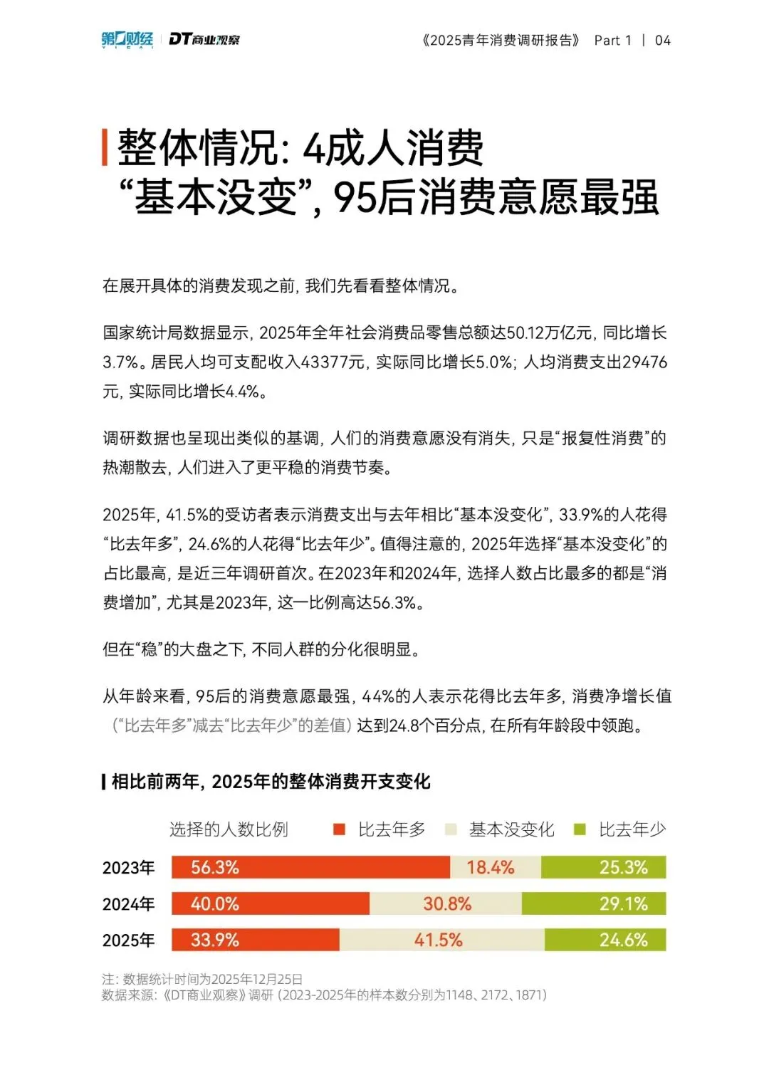 2025年青年消费的最大真相:年轻人不再“买买买”,而是在“投资自己”。当“报复性消费”的热潮散去,41.5%的年轻人消费支出与去年持平,但95后以24.8个百分点的消费净增长值领跑全场——这届年轻人不是不花钱了,而是把钱花在了刀刃上。
