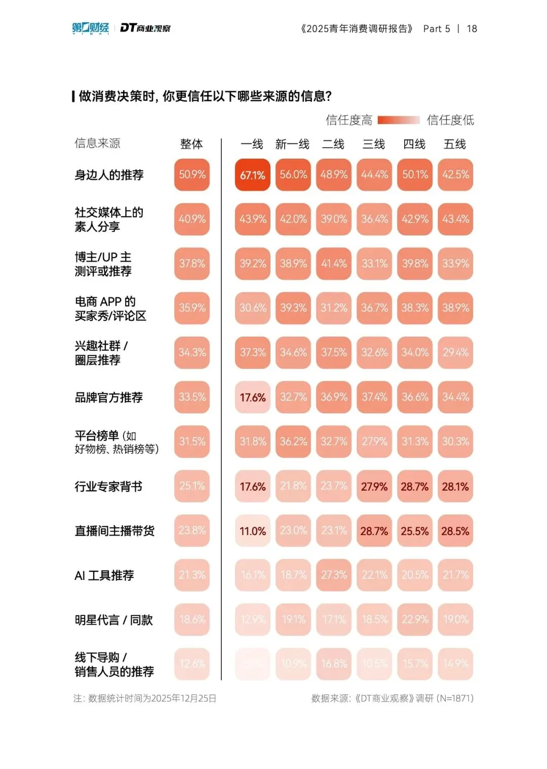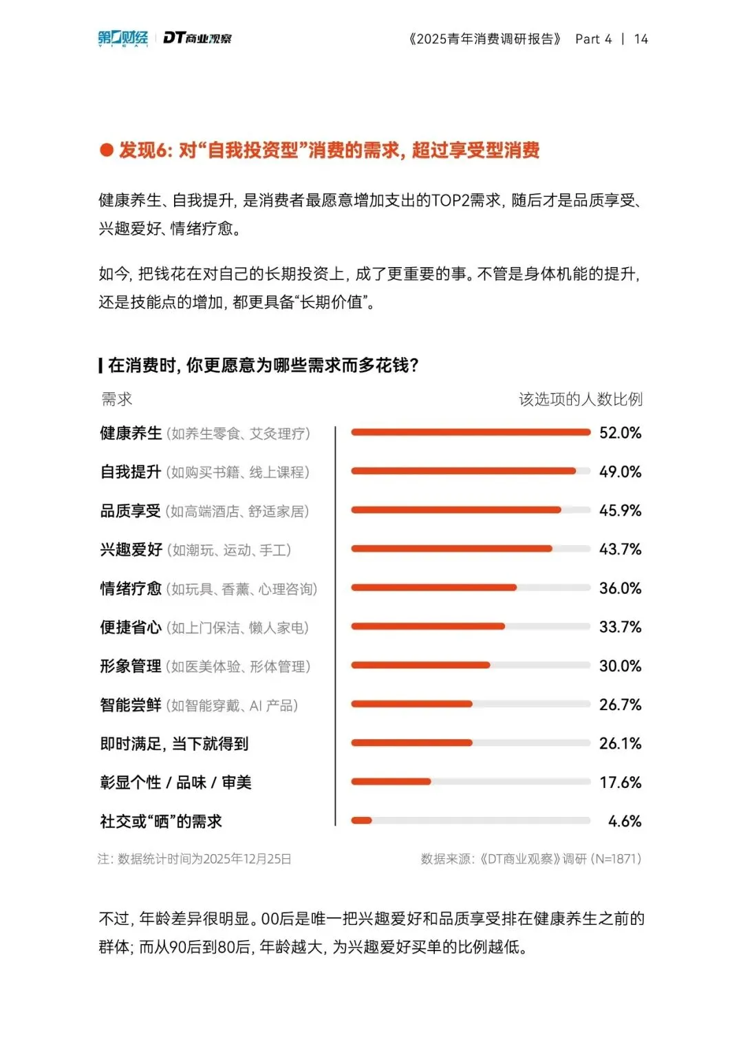 三个结构性迁移正在发生。第一,从“悦他”到“悦己”的赛道切换:旅游和户外活动以26.4个百分点的净值领跑体验型消费,而KTV、剧本杀等社交娱乐持续萎缩,年轻人不再为“合群”买单。第二,从“即时满足”到“长期投资”的价值重估:健康养生和自我提升成为最愿意多花钱的两大需求,“保命主义”崛起,营养品和保健品消费在各年龄段全面开花,连00后也开始囤鱼油和辅酶Q10。第三,从“品牌迷信”到“信任重构”的决策逻辑,身边人的推荐超越一切成为第一信息来源,AI推荐的比例首次超过明星代言——真实个体的使用体验,比任何精心包装的广告都更有说服力。