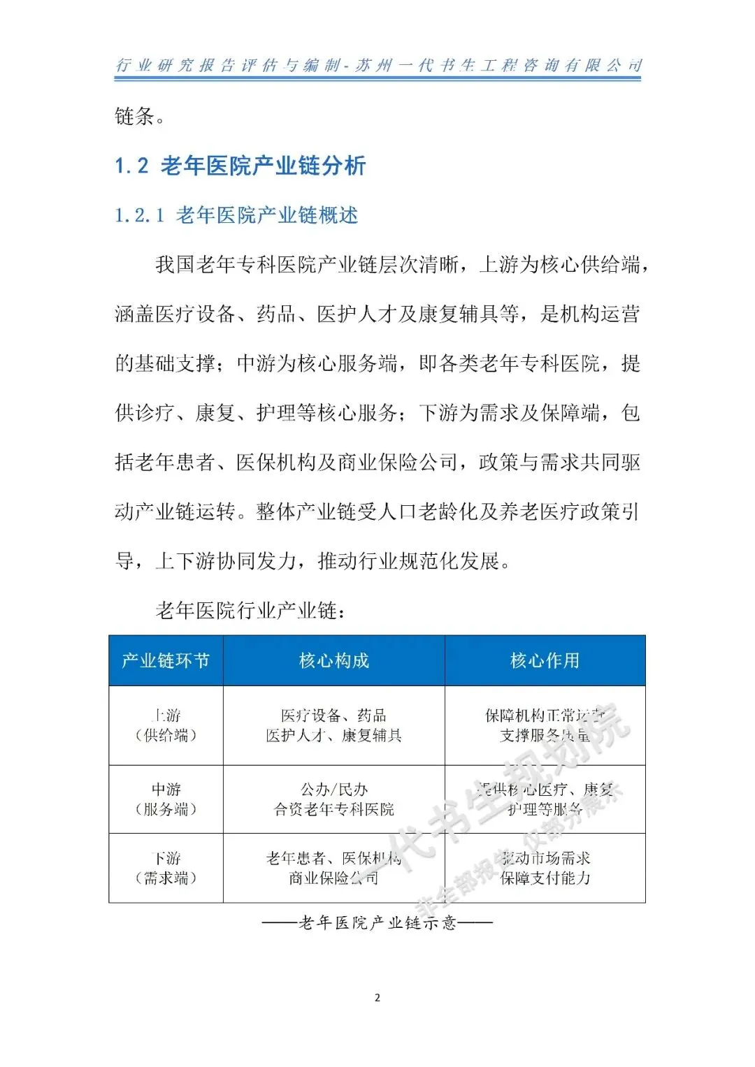 二是市场供需与竞争分析,量化行业市场规模及增长潜力,剖析供需匹配现状与核心矛盾,梳理公立、民营机构竞争格局,解读社会资本布局特点及重点企业运营模式。