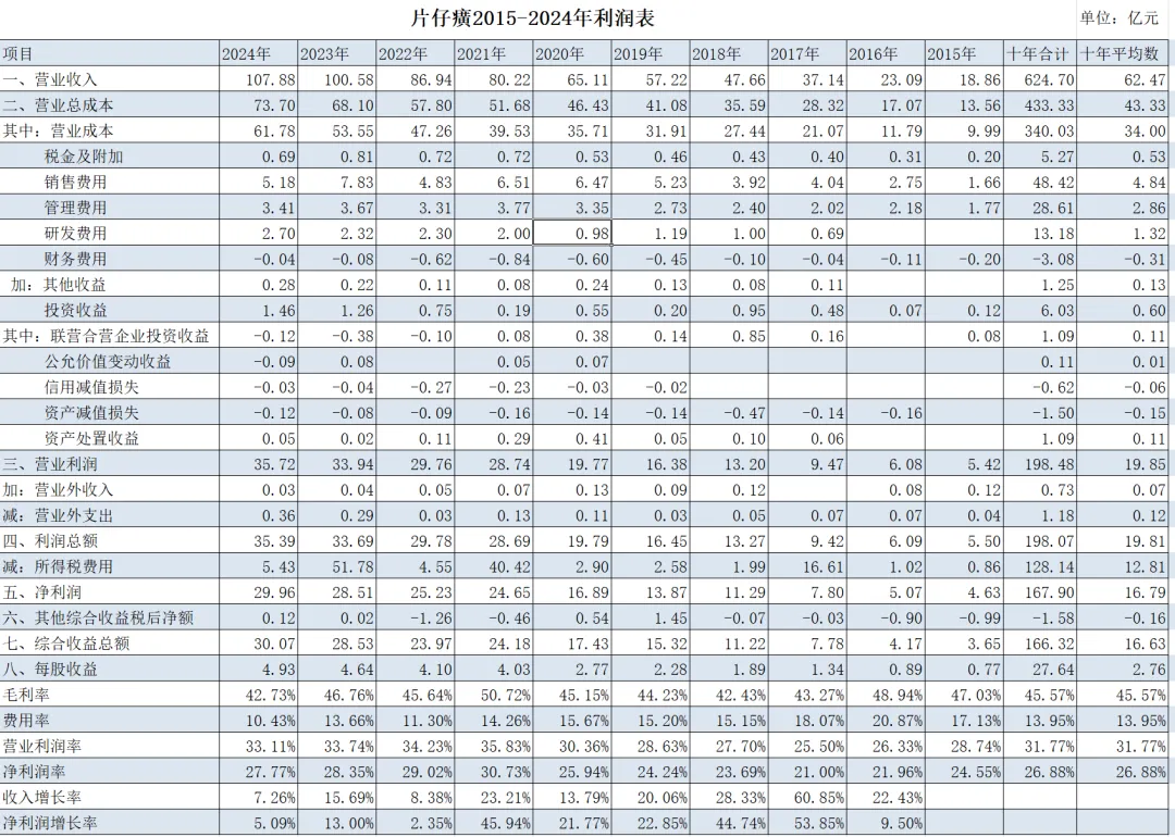 营业利润2024年35.72亿元,2015年5.42亿元,十年营业利润增长6.6倍,年增长率21%。