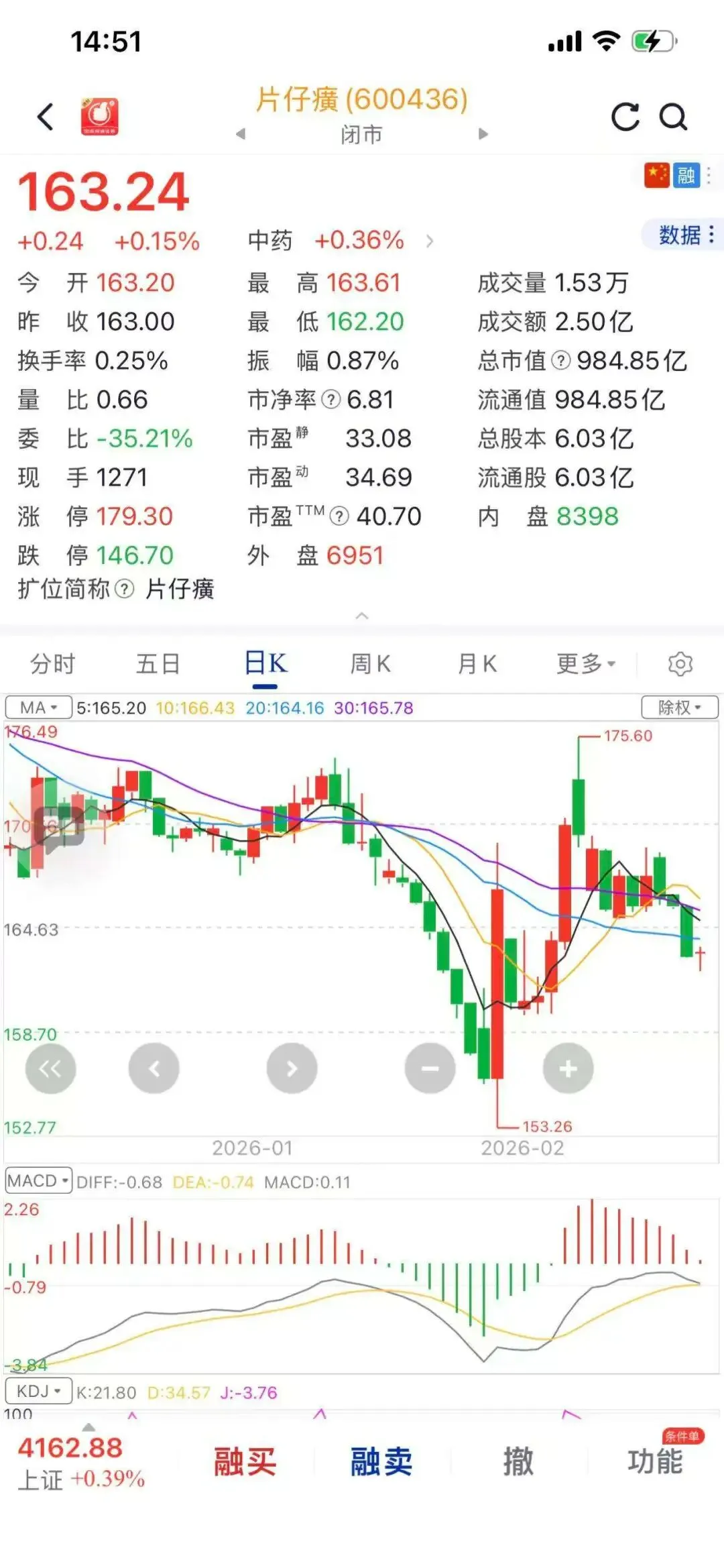 截至2026年2月27日,片仔癀的市值984.85亿元,市盈率34.69倍,估值明显偏高,如果市场先生给力,能够到理想买入价575亿元,可以考虑建仓10%。