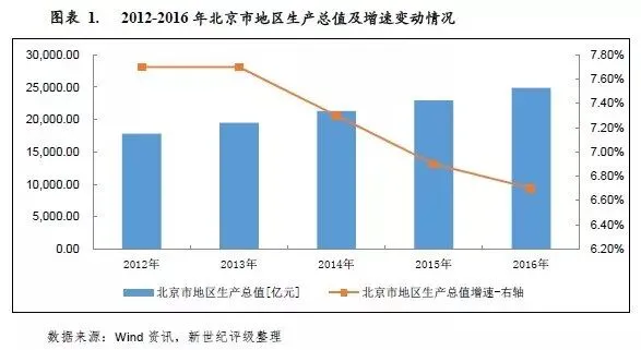 “十二五”时期,北京市地区生产总值年均增长7.50%,低于“十一五”时期平均增速3.90个百分点;2016年北京市地区生产总值增速继续呈下行趋势。受我国经济发展进入新常态和北京市疏解非首都功能、调整经济结构等因素的影响,北京市经济增速整体放缓,但经济总量仍呈现持续、平稳增长。