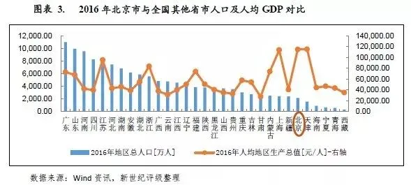 经济实力: 北京市地区经济规模和人均GDP在全国排名前列,经济发展水平较高,2016年,北京市实现地区生产总值2.49万亿元,位居全国各省市[1]第12位,较上年上升一位。从单一城市经济规模看,北京市位居第2位,仅略低于上海。按常住人口计算,全市人均地区生产总值达到11.50万元,位居全国各省市第2位。北京市产业结构相对合理,第三产业占比突出,以金融、信息服务、批发和零售业等产业为主,2016年三次产业结构比例为0.5:19.2:80.3,未来北京市将持续推动产业升级,中心城区的制造型企业将逐步向津冀地区疏解,虽然短期内产业转型升级会对北京市经济增长产生一定的负面影响,但是长期来看,产业的转型升级对缓解其人口压力和带动区域经济持续发展具有较强的促进作用。