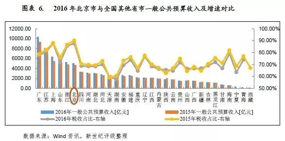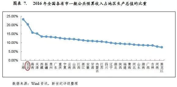 与经济总量相比,北京市一般公共预算收入占地区生产总值的比重较高,2014-2016年分别为18.88%、20.57%和20.41%,2016年,北京市一般公共预算收入占地区生产总值的比重位列全国各省市第2位。