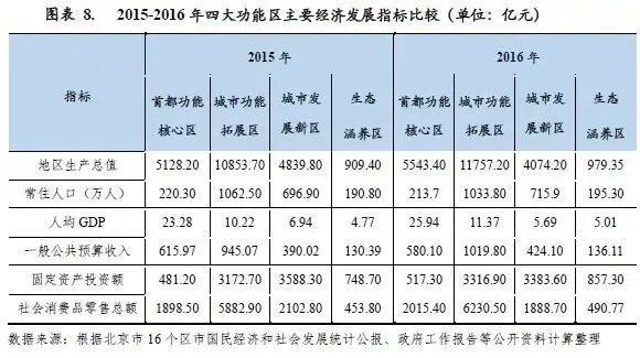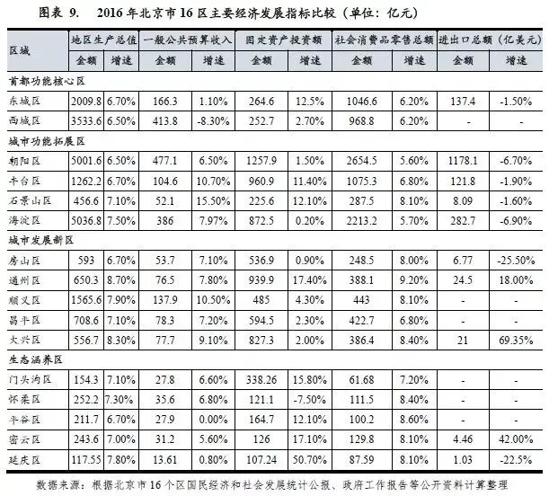 从下辖各区经济情况看,2016年北京市各区经济保持稳健增长,但各区经济发展较不均衡,其中首都功能核心区和城市功能拓展区经济实力较强,是北京经济的主要支撑区,区域产业基础良好,经济发展水平相对较高;城市发展新区是北京市战略发展的新空间和推进新型城市化的重要着力区,区域经济在北京市处于中等水平;生态涵养区经济发展水平相对较低。