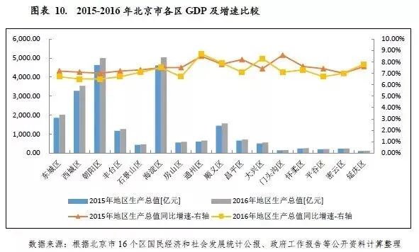 从经济增速来看,2016年各区经济保持平稳增长,GDP增速位于6.50%-8.70%区间,总体增速趋缓,其中城市发展新区GDP增速较快,通州区和大兴区以8.70%和8.30%的增速位列全市前两位;而经济较为发达的中心城六区GDP增速相对较低,其中东城区、西城区、朝阳区、丰台区GDP增速均低于7.00%。