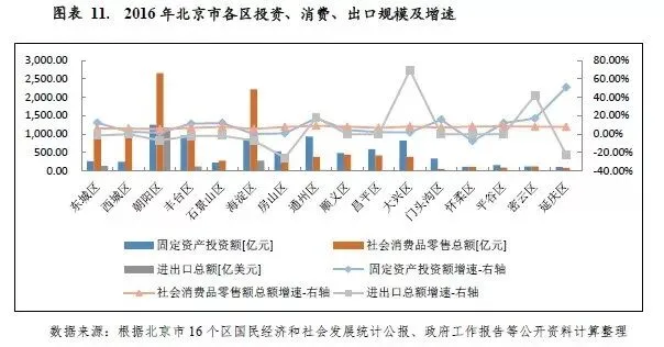 从下辖各区情况来看,2016年北京市各区经济保持稳健增长,但北京市各区经济发展较不均衡,其中首都功能核心区(东城区、西城区)和城市功能拓展区(朝阳区、丰台区、石景山区、海淀区)共同组成中心城六区,经济实力较强,是北京市经济的主要支撑区,区域产业基础良好,经济发展水平相对较高,2016年中心城六区生产总值合计占北京市各区生产总值的77.39%,其中海淀区和朝阳区GDP超过5000亿元,投资、消费和出口规模也处于各区领先地位;城市发展新区(房山区、通州区、顺义区、昌平区、大兴区)是北京市战略发展的新空间和推进新型城市化的重要着力区,区域经济在北京市处于中等水平,其中顺义区和通州区是北京市重点发展的两个新城,顺义区是首都国际航空中心核心区,2016年实现地区生产总值1565.60亿元,排名各区第五。通州区是面向京津冀的门户地区,处于环渤海经济圈的核心枢纽位置,当年实现地区生产总值650.30亿元,同比增速8.70%,增速居各区第一;生态涵养区(门头沟区、怀柔区、平谷区、密云区)是京津冀西北部涵养区的重要组成部分,经济发展水平相对落后,2016年各区地区生产总值不超过300亿元,投资、消费和出口规模也相对较低。