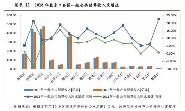 受各区产业结构的影响,北京市各区一般公共预算收入差异较大。西城区、朝阳区和海淀区作为北京市的中心城区,产业多元化程度较高,第三产业发达,纳税主体丰富,税收基础相对较好,2016年一般公共预算收入分别为413.80亿元、477.10亿元和386.00亿元,领先于其他各区;门头沟区和延庆区2016年一般公共预算收入分别为27.8亿元和13.61亿元,财力有限。从增速来看,由于“营改增”全面实施及税收分配政策调整等因素影响,各区一般公共预算收入增速趋缓,个别区域出现负增长。其中石景山区、丰台区和顺义区实现两位数增速,而东城区和西城区增速较低,分别为1.10%和-8.30%。