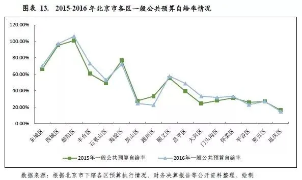 受产业结构和城市区位功能差异的影响,北京市各区之间一般公共预算收入规模差异较大。其中西城区、朝阳区和海淀区,三产发达,一般公共预算收入质量较好;但城市发展新区和生态涵养区中除顺义区外一般公共预算自给率均低于50%,收支平衡主要依赖于上级补助。