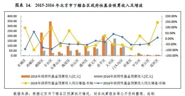 2016年,北京市政府性基金预算收入同比下降35.10%,除西城区、大兴区、门头沟区和延庆区外,其他下辖区政府性基金预算收入均出现下降,其中降幅较大的地区为东城区和丰台区,下降幅度均超过90%。