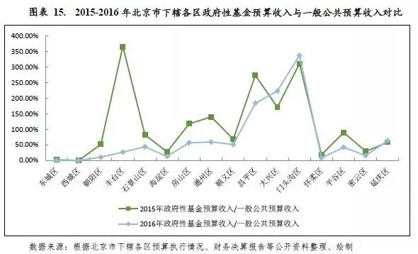 受土地和房地产市场调控政策影响,2016年北京市下辖各区房地产开发投资增速普遍放缓,部分地区出现了负增长;除西城区、大兴区、门头沟区和延庆区外,其他下辖区2016年政府性基金预算收入均出现下降。与一般公共预算收入规模相比,2016年昌平区、大兴区和门头沟区地方财力对政府性基金预算收入的依赖度较高。