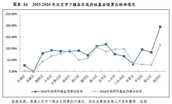 从政府性基金预算自给率情况看,2016年北京市下辖各区中海淀区、顺义区、大兴区、门头沟区和延庆区政府性基金预算收入对其支出的覆盖程度较好,政府性基金预算自给率均超过90%,其中顺义区和延庆区政府性基金预算自给率超过了100%。而东城区和西城区财力主要靠一般公共预算收入贡献,对政府性基金预算收入的依赖度低,其政府性基金预算自给率也相对偏低。
