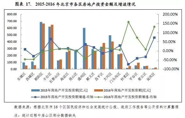 从增速看,2016年北京市房地产投资呈现负增长,增速为-4.30%,较上年下降了12.40个百分点。当年北京市大部分区域房地产投资增速较2015年放缓,其中房地产投资增速上升的仅有昌平区、大兴区、怀柔区、平谷区、密云区和延庆区,增速分别为16.50%、12.30%、158.50%、72.30%、7.50%和132.20%,较上年分别增长了29.90个百分点、12.40个百分点、232.60个百分点、113.10个百分点、39.80个百分点和59.40个百分点。此外北京市16个区中5个区房地产投资完成额呈负增长状态,包括东城区、西城区、朝阳区、通州区、顺义区,其中东城区和西城区房地产开发投资增速分别为-46.10%和-46.30%。