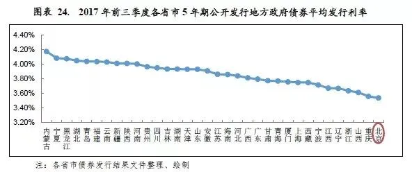 截至2017年9月末,北京市地方政府债券存量余额为3378.71亿元,是北京市政府债务的主要构成部分,占2017年北京市政府债务限额的43.67%。从地方政府债券发行利率看,北京5年期公开发行地方政府债券平均发行利率为3.54%,低于同期限其他各省市5年期公开发行地方政府债券发行利率。