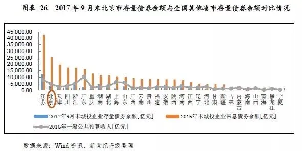 以城投债存续余额与一般公共预算收入规模相对比, 2017年9月末北京市城投债存续余额是其2016年一般公共预算收入的0.60倍,处于中等水平,较上年有所下降。