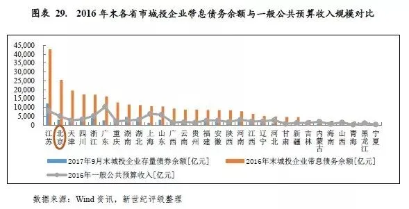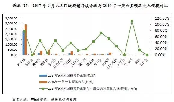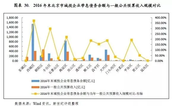 以北京市各区城投企业带息债务余额与一般公共预算收入规模相对比,西城区、丰台区、海淀区、平谷区、大兴区、顺义区和昌平区2016年末城投企业带息债务分别是当年一般公共预算收入的3.73倍、2.98倍、2.20倍、1.93倍、1.89倍、1.88倍和1.55倍;其他各区2016年末城投企业带息债务余额与当年一般公共预算收入的比率均在50%以下。