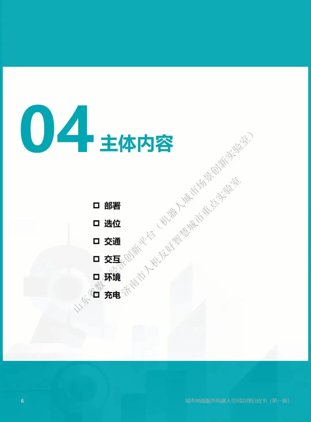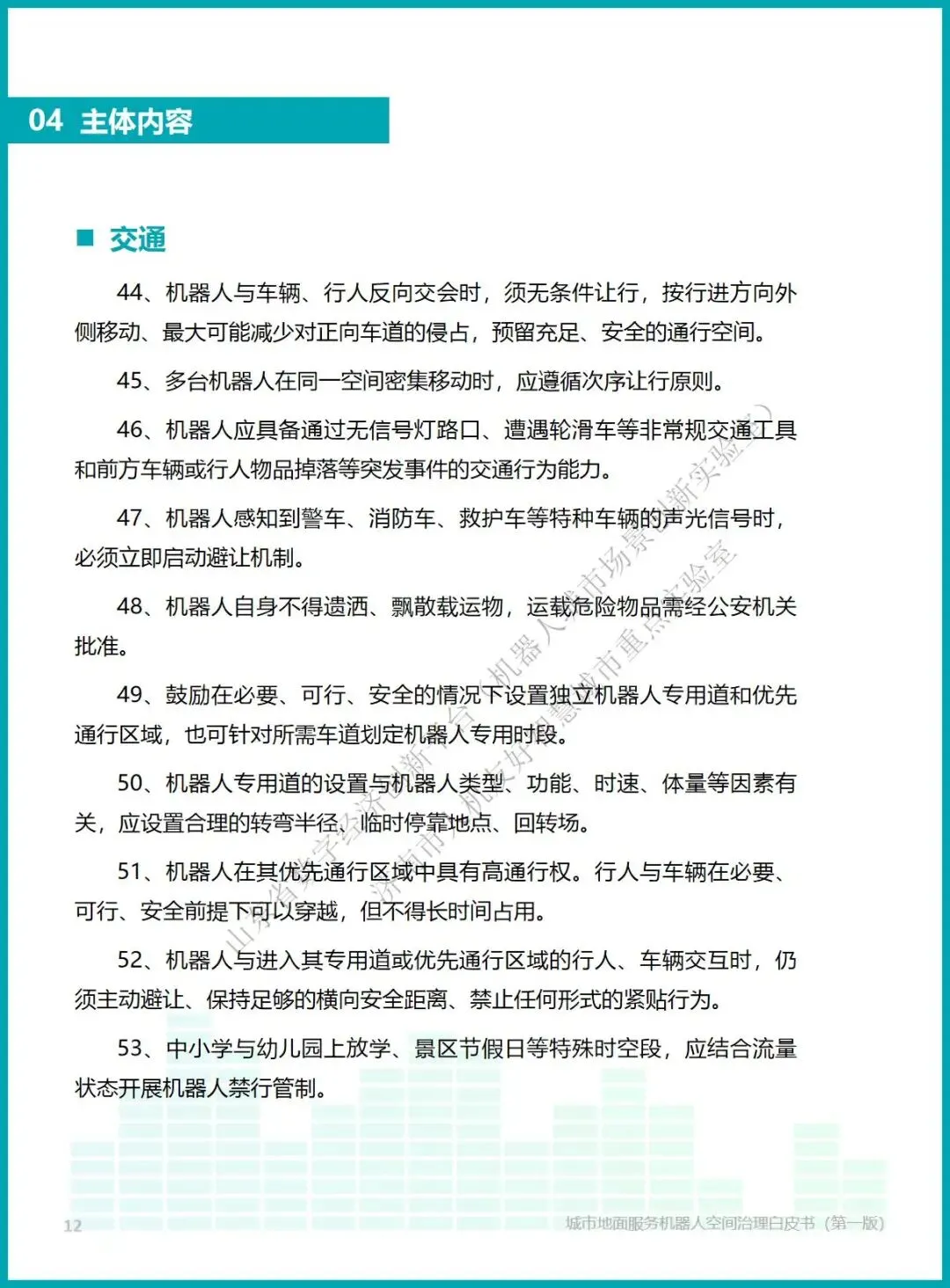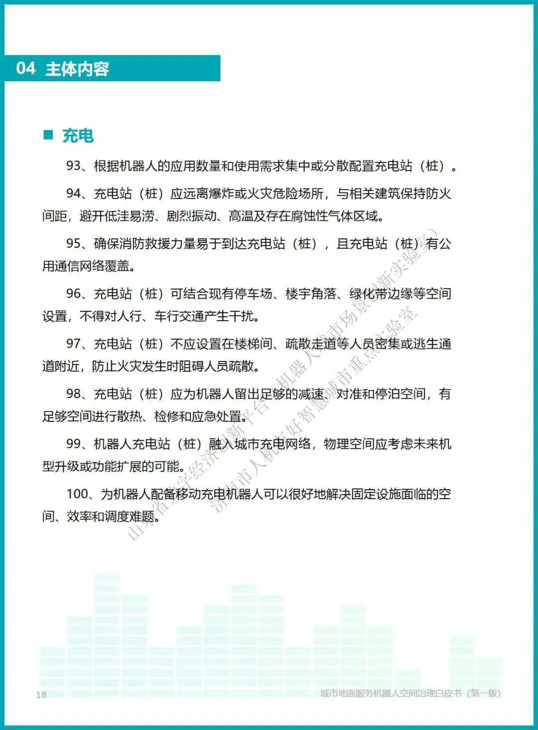 随着机器人技术的快速发展,城市地面服务机器人已成为城市公共服务与空间运营的重要参与者,其在城市开放空间的规模化应用,也对城市空间治理提出了全新要求。为适配机器人时代发展需求,推动人、机器人与城市空间的共融发展,优化城市空间治理模式、提升公共服务质量。白皮书明确了城市地面服务机器人空间治理的涉及对象与遵循原则,从部署、选位、交通、交互、环境、充电六大核心维度制定具体治理要求,并提出针对性实施建议,为城市地面服务机器人在开放空间的合理布局、安全运行提供系统性指引,助力未来智慧城市的建设与发展。