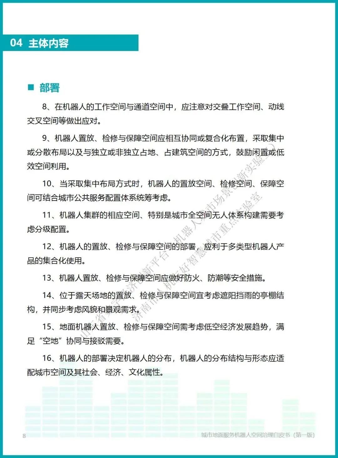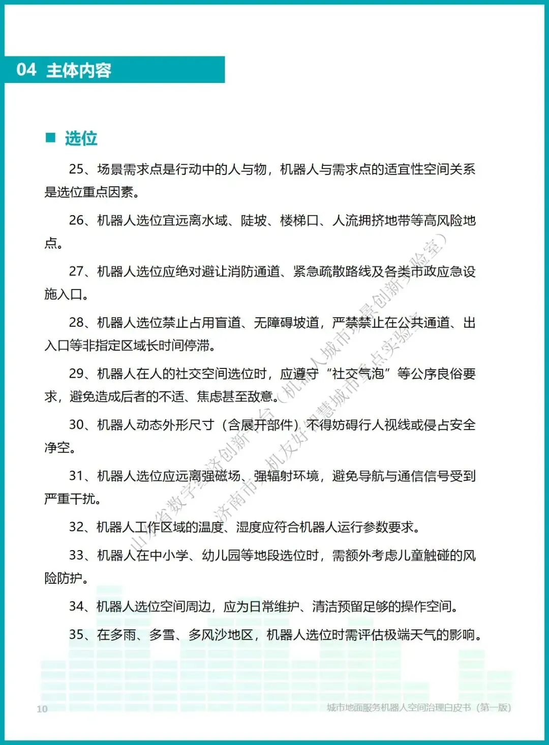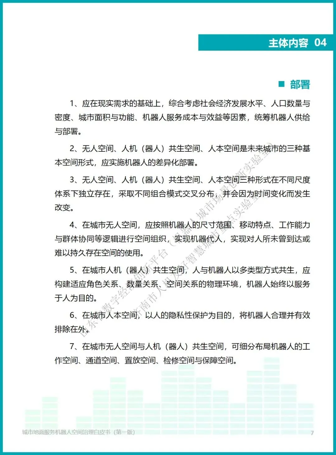 随着机器人技术的快速发展,城市地面服务机器人已成为城市公共服务与空间运营的重要参与者,其在城市开放空间的规模化应用,也对城市空间治理提出了全新要求。为适配机器人时代发展需求,推动人、机器人与城市空间的共融发展,优化城市空间治理模式、提升公共服务质量。白皮书明确了城市地面服务机器人空间治理的涉及对象与遵循原则,从部署、选位、交通、交互、环境、充电六大核心维度制定具体治理要求,并提出针对性实施建议,为城市地面服务机器人在开放空间的合理布局、安全运行提供系统性指引,助力未来智慧城市的建设与发展。