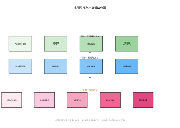 中国金刚石散热市场的特点包括:原材料供应充足,中国企业在人造金刚石原材料方面具有绝对优势;产业链配套完善,从金刚石生长到散热产品制造的完整产业链已初步形成;政策支持