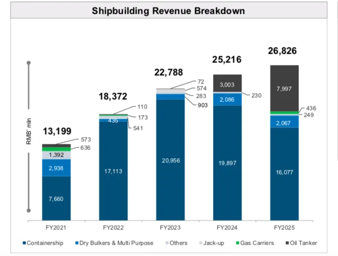 财报称,扬子江船业2025年经营业绩主要得益于核心造船业务的显著增长。2025年,扬子江船业造船业务营收约268亿元,同比增长6.4%,占扬子江船业营收的比例约为94%。而且造船业务毛利率上升了7.3个百分点。这主要因为新造船价格的提高以及原材料成本的有利变化,以及报告期内新造船合同的顺利推进。