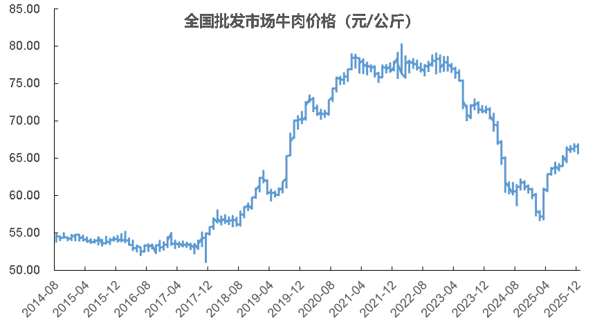 2025年,肉牛去产能加速,存栏量连续三个季度低于1亿头,带动活牛及牛肉价格反弹。国家统计局数据显示,全国集贸市场活牛均价从2月份的低点25.68元/公斤上涨至12月的28.40元/公斤,涨幅为10.6%,同比涨幅10.4%;同期牛肉批发价格从57.36元/公斤涨至65.91元/公斤,涨幅为14.9%,同比涨幅9.5%。创近三年最强反弹。