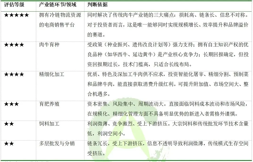 肉牛产业链不同环节的投资价值已出现显著分化。基于当前市场阶段和未来趋势,艾格农业对各环节的投资价值进行了评估。根据价值从低到高的顺序,评估等级设定为从一星到五星。