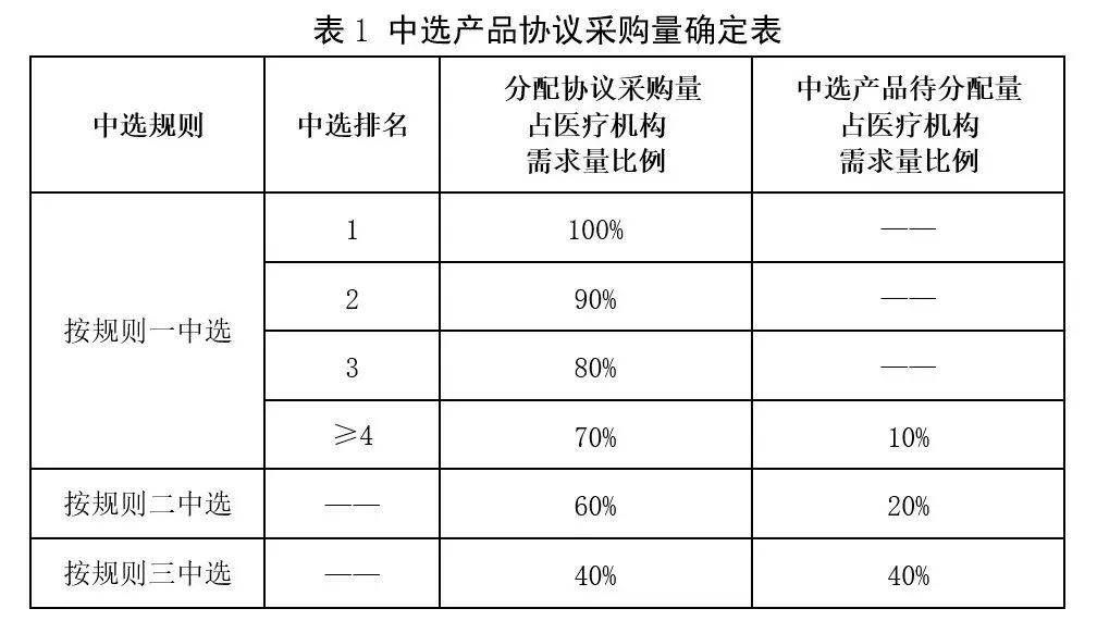 第一步是梯度分配协议采购量,核心是“按中选排名,梯度分配”。所谓梯度分配,简单来说,就是中选排名越靠前,获得的协议采购量比例越高。