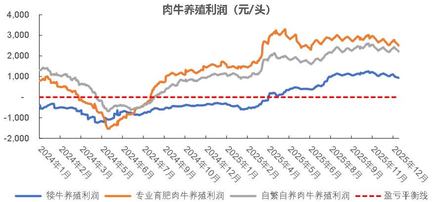 在价格反弹的利好作用下,肉牛养殖长期亏损的局面得到扭转。自4月起,犊牛养殖结束了史上最长的亏损周期,进入全行业盈利;育肥牛养殖则早在2024年秋季就扭亏为盈。截至年底,以市场价推算,250公斤犊牛的头均养殖利润稳定在千元以上,650公斤育肥牛头均养殖利润则在3000元左右。随着肉牛养殖效益全面好转,各主产区提前出栏和淘汰母牛现象得到遏制,市场信心有所恢复,产业复苏有望。