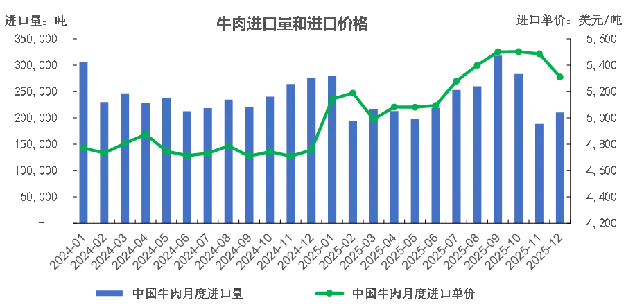 2025年,中国牛肉进口波动性显著高于往年。开年以后,牛肉进口量连续5月同比下降,1-5月累计进口量110万吨,同比降幅高达11.7%,为近5年来同期最大降幅。从6月开始,牛肉进口恢复同比增长,9月进口量接近32万吨,创单月进口量的历史最高记录;全年牛肉累计进口量283万吨,虽略低于去年,但仍未历史第二高水平。与此同时,进口牛肉到岸价从年初5100美元/吨涨至9-10月的5500美元/吨,同比上涨16.8%,为过去两年来的最高点。上半年牛肉进口量出现明显回落,有效缓解了低价进口牛肉对国内市场的冲击,成为肉牛市场回暖的最重要因素之一;而从第三季度开始的牛肉进口量价齐升的局面,又导致下半年肉牛市场供需形势趋于复杂化。