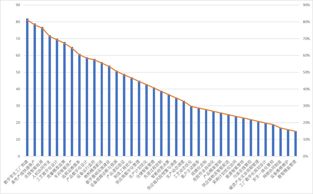 在线智能检测(76.2%) 和 人机协同作业(71.3%) 分别从质量监控和复杂装配环节支撑了生产过程的精准管控与效率提升。