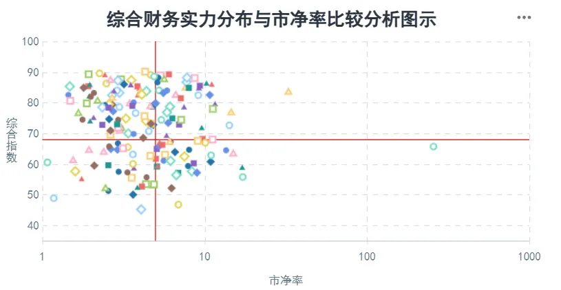 在公司的发展能力、经营稳定性及增长潜力的基础上,结合公司主营业务所属行业的分析、资产结构或资产质量分析、主营业务运营效率分析、受评主体的行业地位分析以及偿付能力的分析做出的公司综合财务实力分析判断。分数越高,公司的综合财务实力越强。处在右下区域的公司,市净率较高且相关指数较低,则存在公司综合财务实力不足的潜在风险。