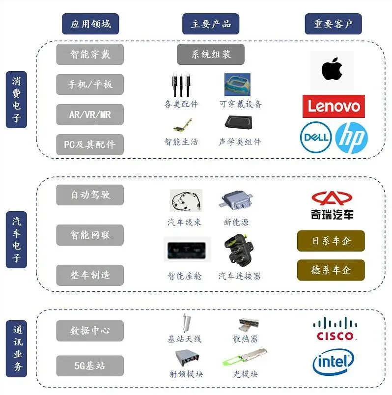 公司成立于2004年5月24日,总部位于广东省东莞市,2010年9月15日于深交所主板上市,发行价28.8元/股,上市融资金额将近12亿,历年分红如下图1-2。公司所属行业为计算机、通信和其他电子设备制造业,主要业务就是生产经营连接线、连接器、声学、无线充电、马达及天线等零组件、模组与配件类产品,根据2024年财报显示,消费性电子为第一大收入来源,占比83.37%。登录官网没看到具体的产品展示就百度了一下,公司的产品矩阵展示如下图3。
