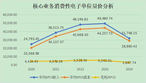 第三张图展示出企业的平均KPCS收入受到上游原材料成本的影响很明显,基本是同步涨跌的一个关系,也就是说,上游原材料价格的波动会影响企业的营收规模,而且在2024年的平均KPCS毛利水平相比之前四年都有一个非常大的降幅,需要重点关注。(注:按照公司财报的解释,KPCS这个术语是“千件”的意思。)
