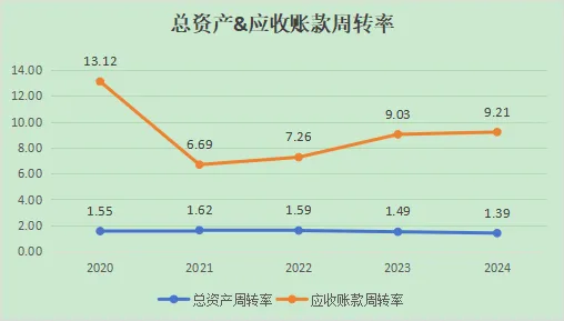 5. 总资产周转率:营业收入÷总资产(ToC的公司可以重点考查存货周转率,ToB的公司可以重点考查应收账款周转率)。横向对比的事情就交给各位朋友了,也正好锻炼自己看财报的能力。