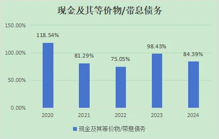 这一块需要关注,分析了这么多家企业以来,这是第一家不是近五年都保持在100%以上的,说明相对于现金等价物来说企业的负债水平比较高了!