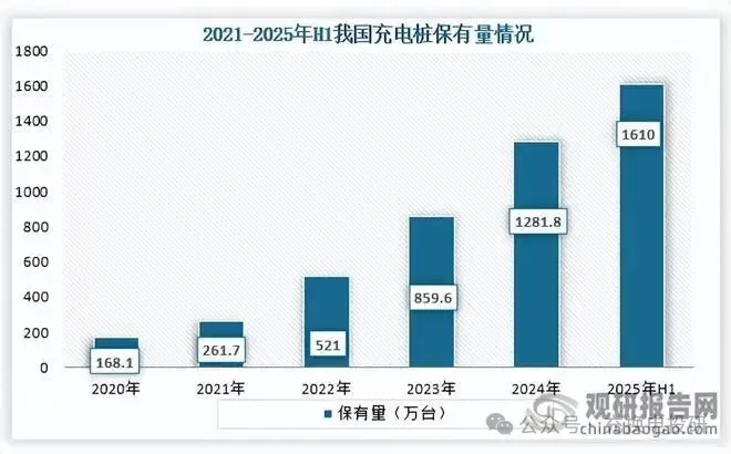 从保有量来看,2020年到2025年H1我国充电桩保有量从168.1万台增长到了1610万台,2025年H1我国充电桩保有量为数量为1610万台,同比增长55.6%。
