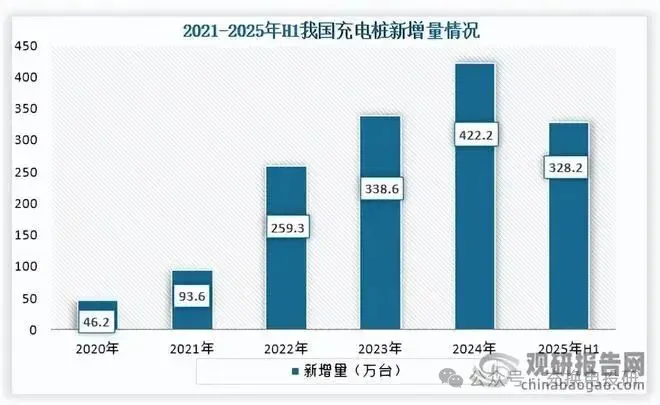 从新增量来看,2020年到2024年我国充电桩新增量持续增长,到2025年1-6月我国充电桩新增量为328.2万台,同比增长99.2%。