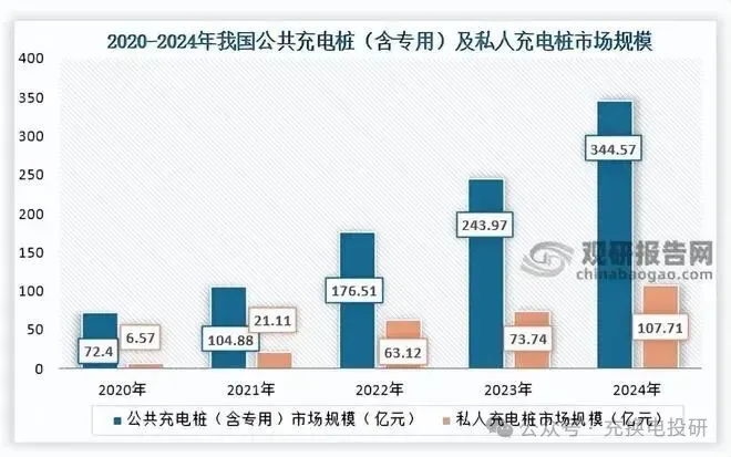 从市场规模来看,2020年到2024年我国充电桩市场规模持续增长,从细分市场来看,2024年我国公共充电桩(含专用)市场规模约为344.57亿元;私人充电桩市场规模约为107.71亿元。