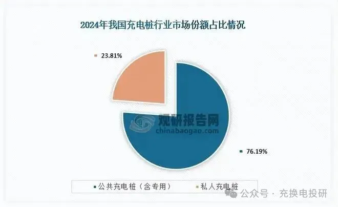 从市场份额占比来看,2024年我国公共充电桩(含专用)占比为76.19%;私人充电桩占比为23.81%。整体来看,虽然在数量私人充电桩多,但是在市场规模方面是公共充电桩规模更大。