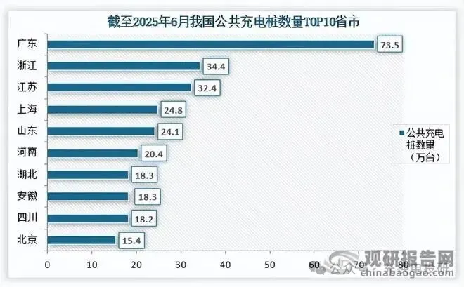 从各省市公共充电桩数量来看,截至2025年6月我国公共充电桩数量TOP10省市合计占比达到了67.0%,其中前三的省市分别为广东、浙江、江苏;数量分别为73.5万台、34.4万台、32.4万台。