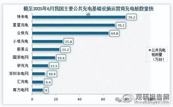 从企业来看,截至2025年6月我国充电运营企业所运营充电桩数量前三分别为特来电、星星充电、云快充;数量分别为79.2万台、70.2万台、64.8万台。