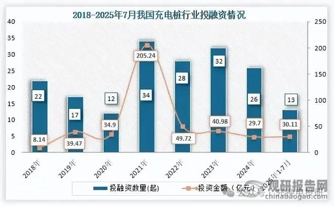 从行业投融资情况来看,2018年到2024年我国充电桩投融资事件及金额为上下波动趋势,到2024年我国充电桩行业发生投融资事件26起,投融资金额为29.7亿元;2025年1-7月我国充电桩行业发生投融资事件13起,投融资金额为30.11亿元,已经超过2024年全年投融资金额。