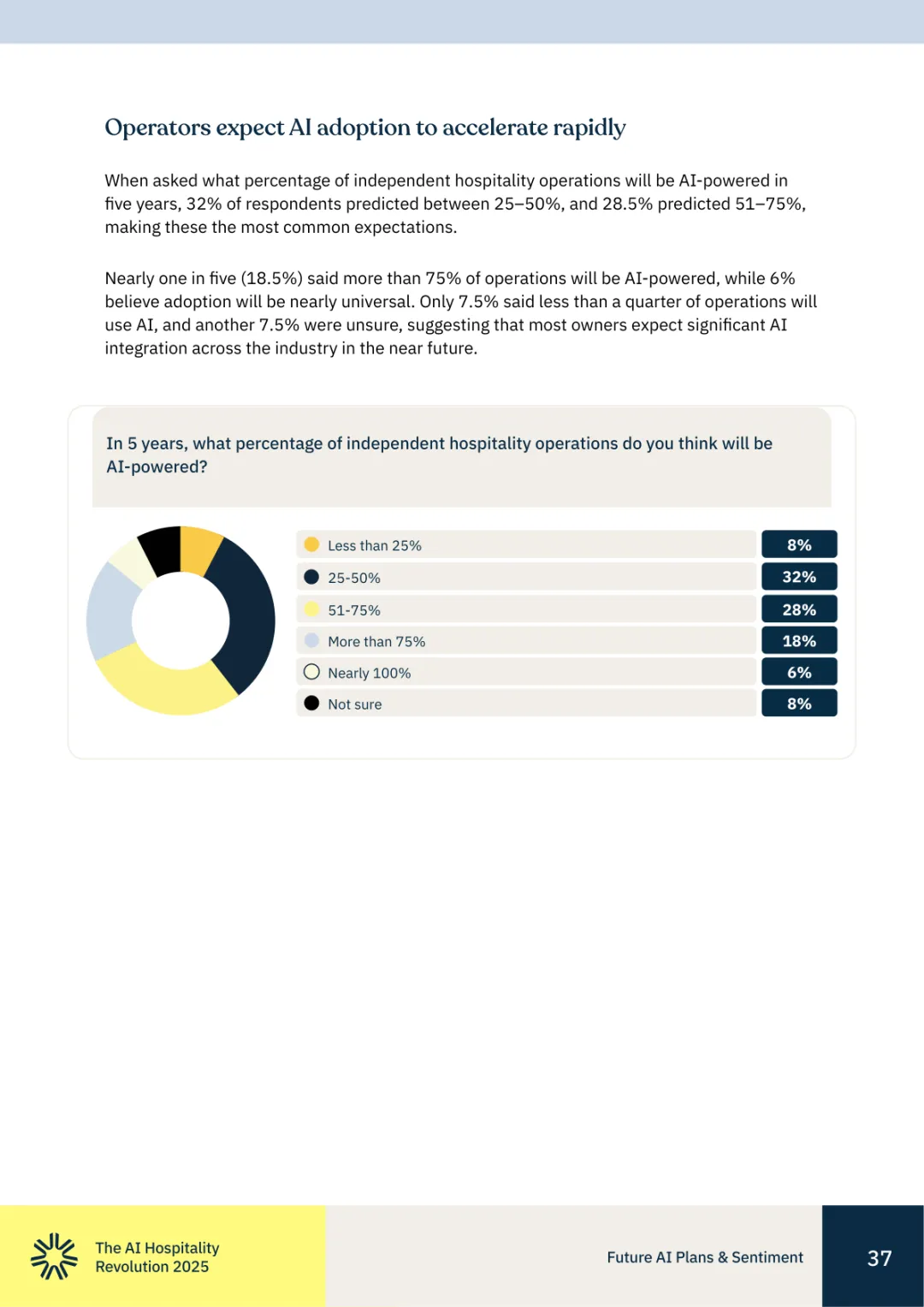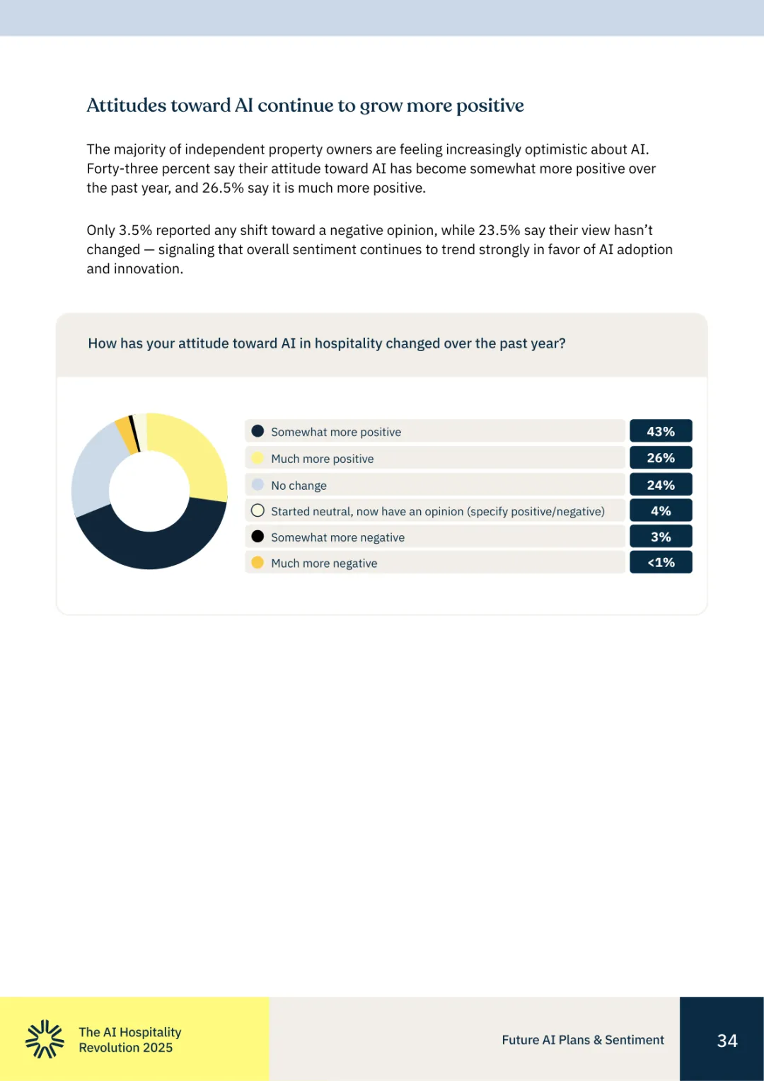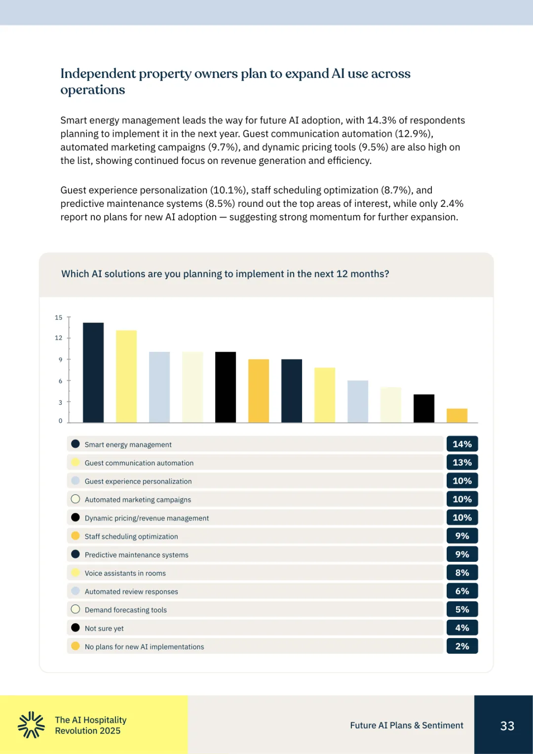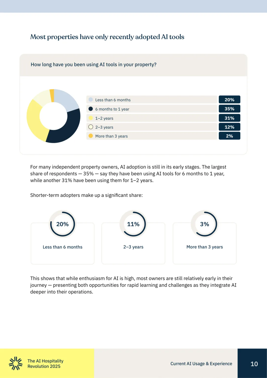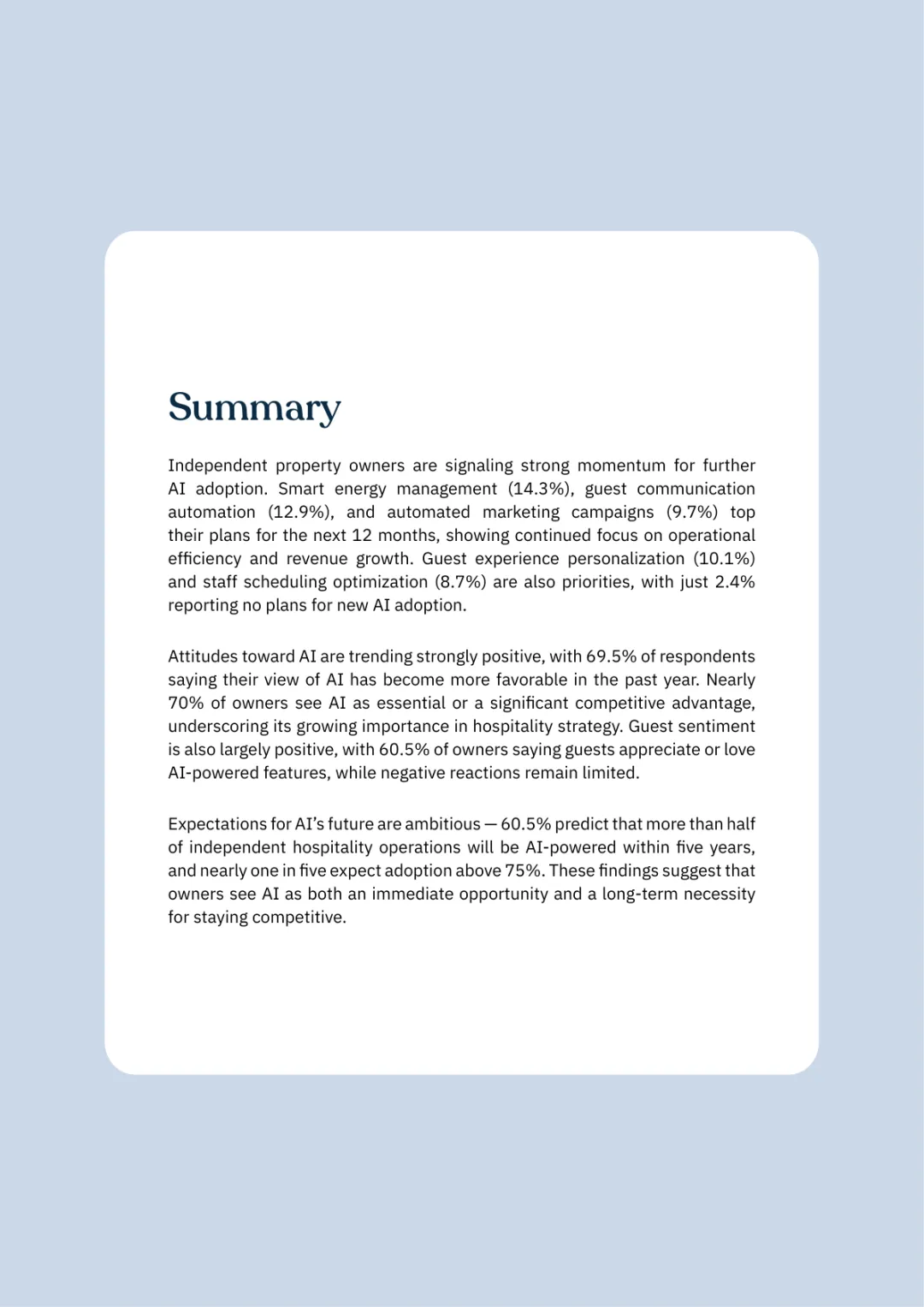 导读:2025 年酒店业人工智能革命研究报告基于对 200 名独立住宿业态经营者的调研,展现了 AI 在行业的落地现状与发展趋势。调研对象涵盖度假租赁、民宿、精品酒店等多种类型,超七成经营者使用 AI 不足两年,行业整体处于 AI 应用初期。AI 在客群沟通、营销推广、社媒运营等客面场景应用最广泛,节省时间与提升效率是经营者引入 AI 的核心动因,自动化客群沟通也成为创造价值最高的 AI 应用方向,超七成经营者表示 AI 效果达到或超出预期,员工对 AI 工具的接受度也处于较高水平。行业在 AI 落地中仍面临技术专业度不足、员工培训难度大、系统融合不畅等问题,经营者也担忧技术会削弱服务的人文属性,同时对数据安全存在顾虑。不过 AI 已为行业带来切实回报,超八成经营者实现营收增长,且多数能在半年内看到应用效果。未来经营者计划重点布局智能能源管理、客群沟通自动化等领域,近七成认为 AI 是保持竞争力的关键,行业对 AI 的整体预期积极,多数预判五年内超半数独立住宿业态将实现 AI 化运营。