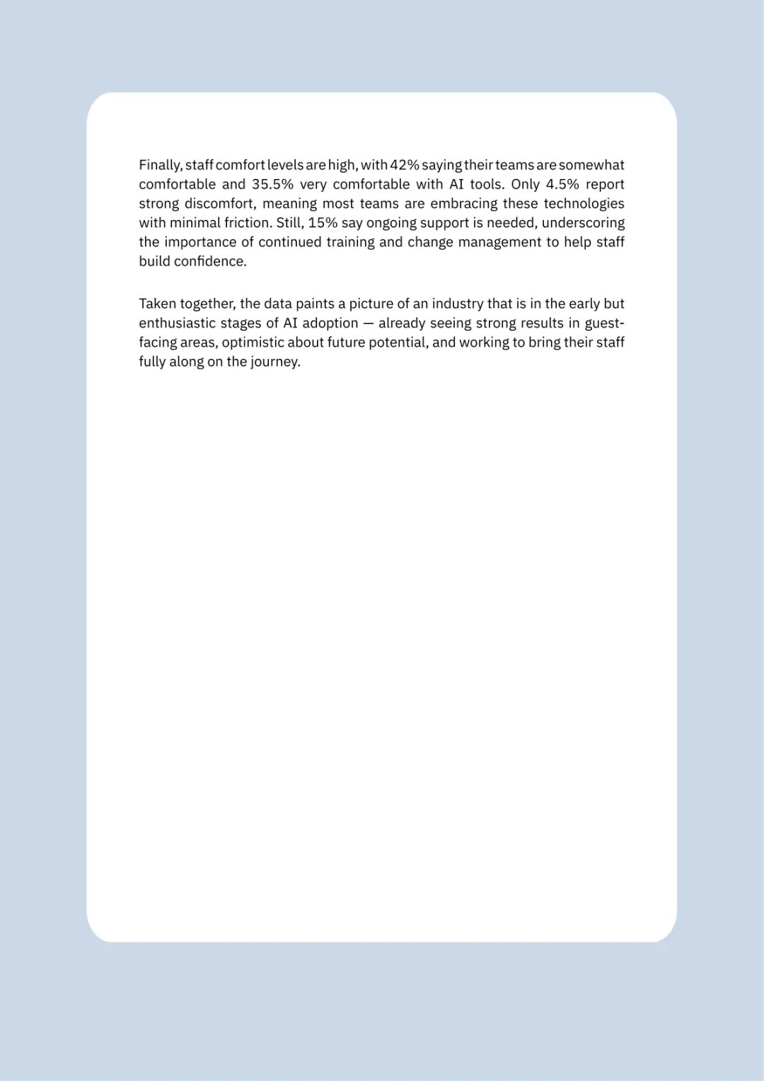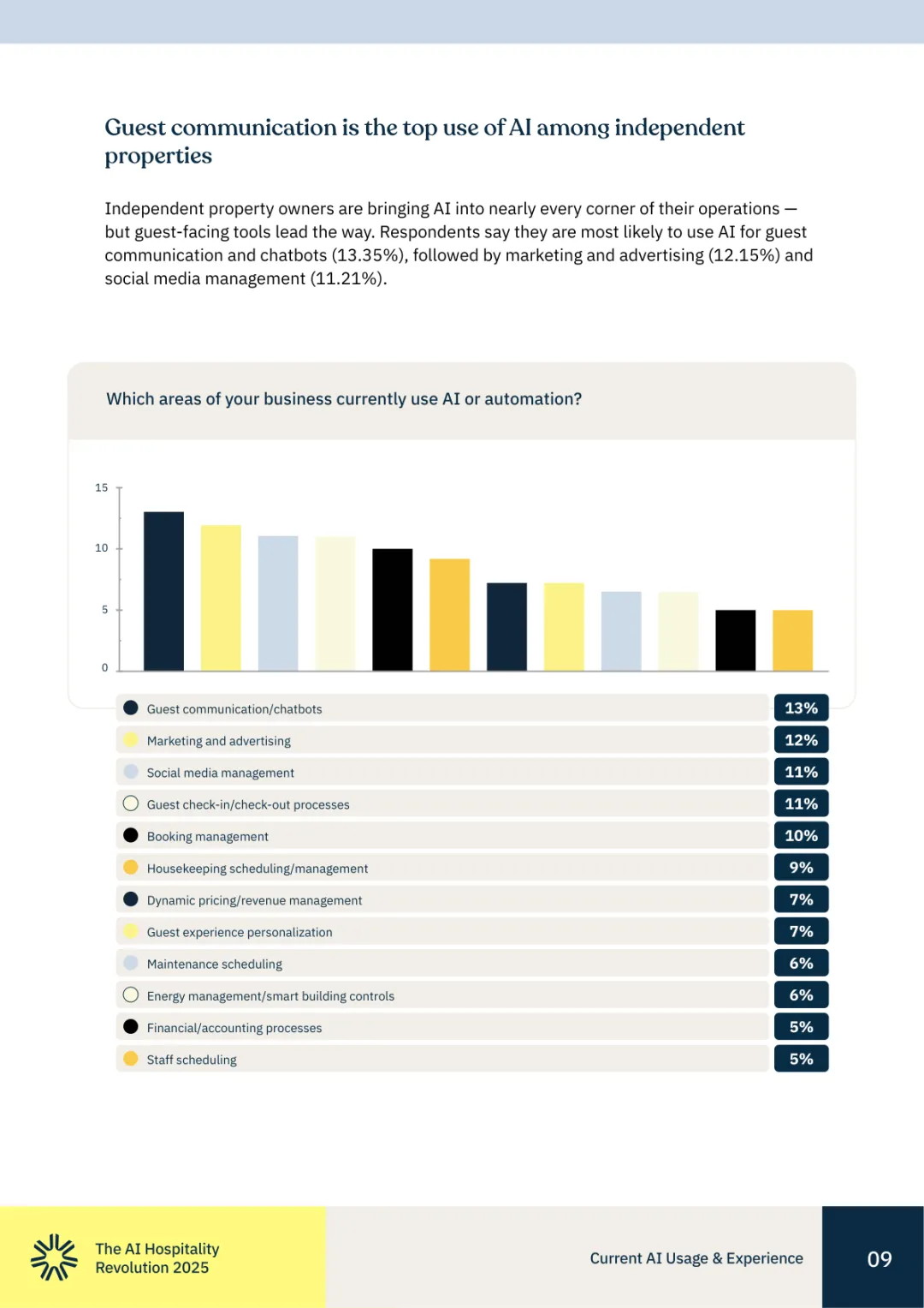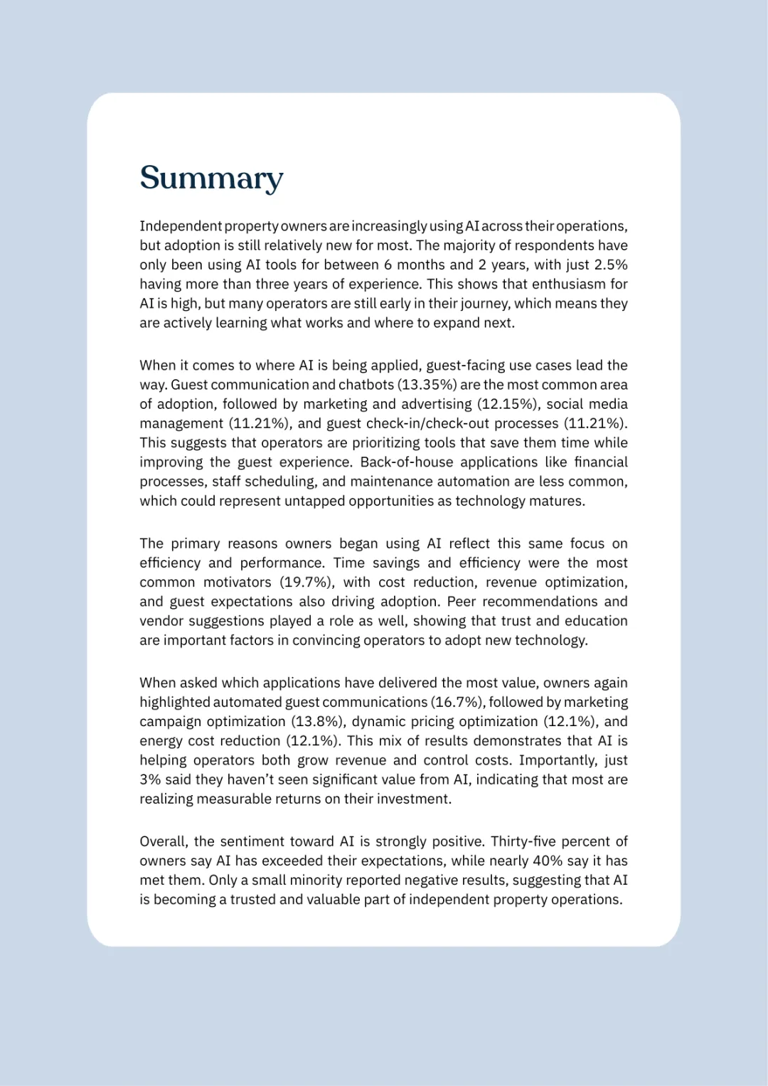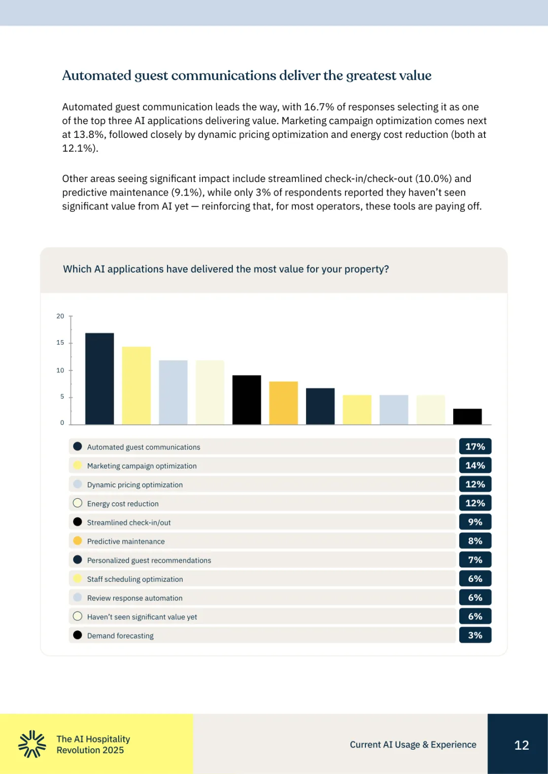 导读:2025 年酒店业人工智能革命研究报告基于对 200 名独立住宿业态经营者的调研,展现了 AI 在行业的落地现状与发展趋势。调研对象涵盖度假租赁、民宿、精品酒店等多种类型,超七成经营者使用 AI 不足两年,行业整体处于 AI 应用初期。AI 在客群沟通、营销推广、社媒运营等客面场景应用最广泛,节省时间与提升效率是经营者引入 AI 的核心动因,自动化客群沟通也成为创造价值最高的 AI 应用方向,超七成经营者表示 AI 效果达到或超出预期,员工对 AI 工具的接受度也处于较高水平。行业在 AI 落地中仍面临技术专业度不足、员工培训难度大、系统融合不畅等问题,经营者也担忧技术会削弱服务的人文属性,同时对数据安全存在顾虑。不过 AI 已为行业带来切实回报,超八成经营者实现营收增长,且多数能在半年内看到应用效果。未来经营者计划重点布局智能能源管理、客群沟通自动化等领域,近七成认为 AI 是保持竞争力的关键,行业对 AI 的整体预期积极,多数预判五年内超半数独立住宿业态将实现 AI 化运营。