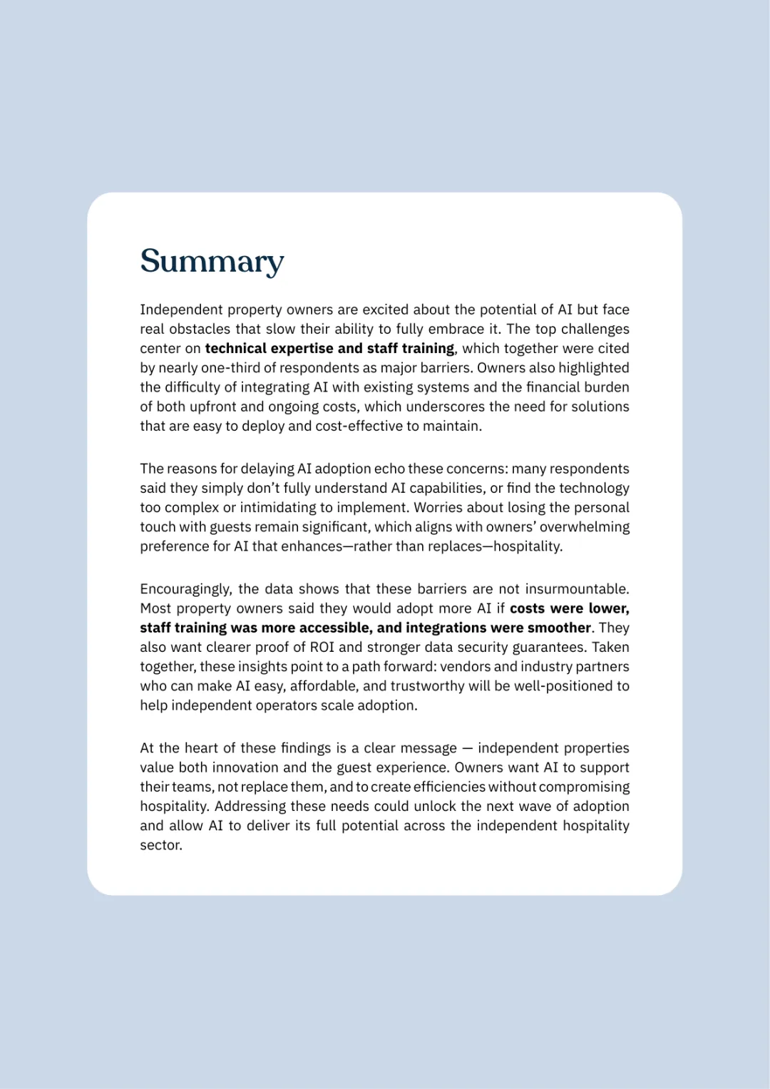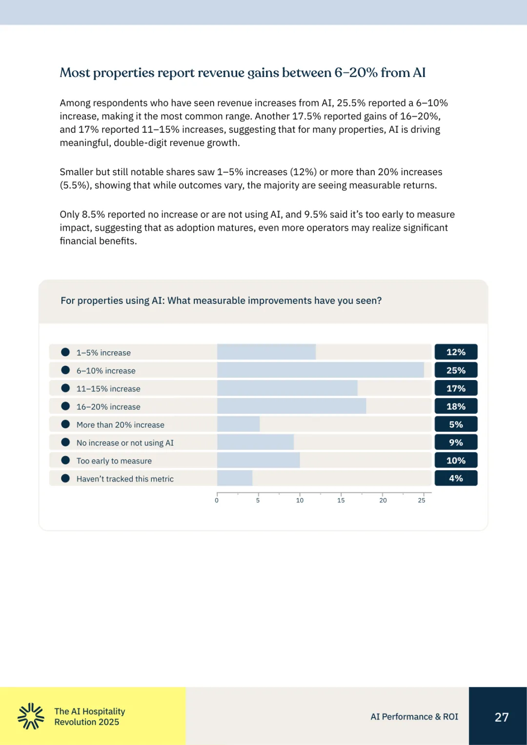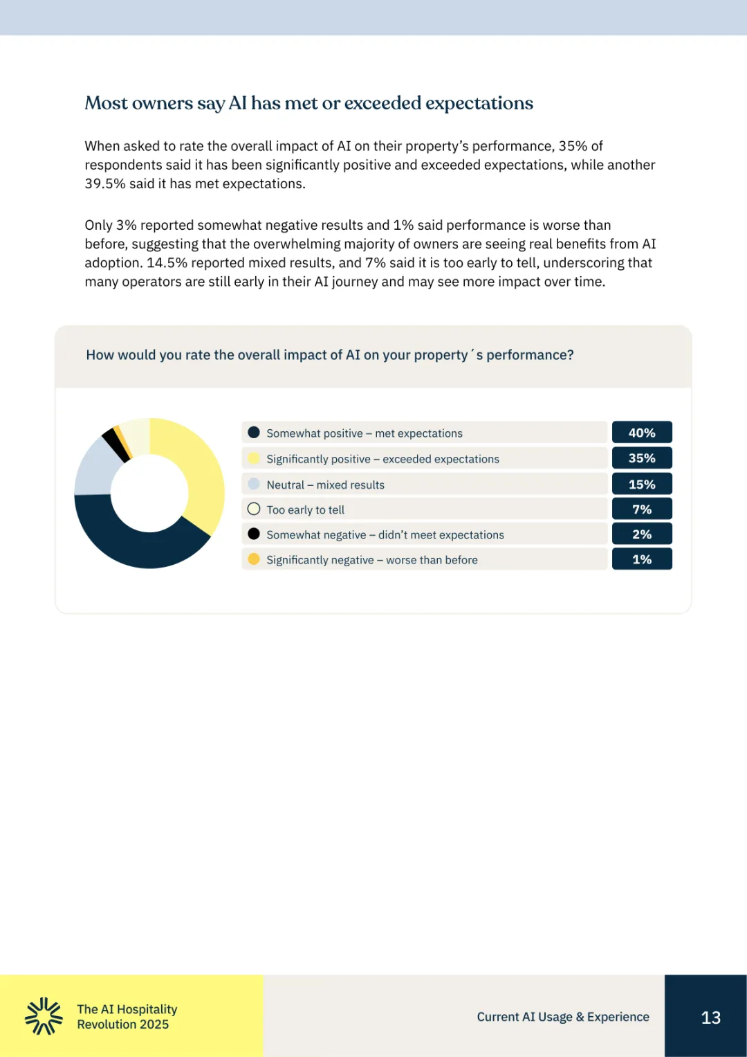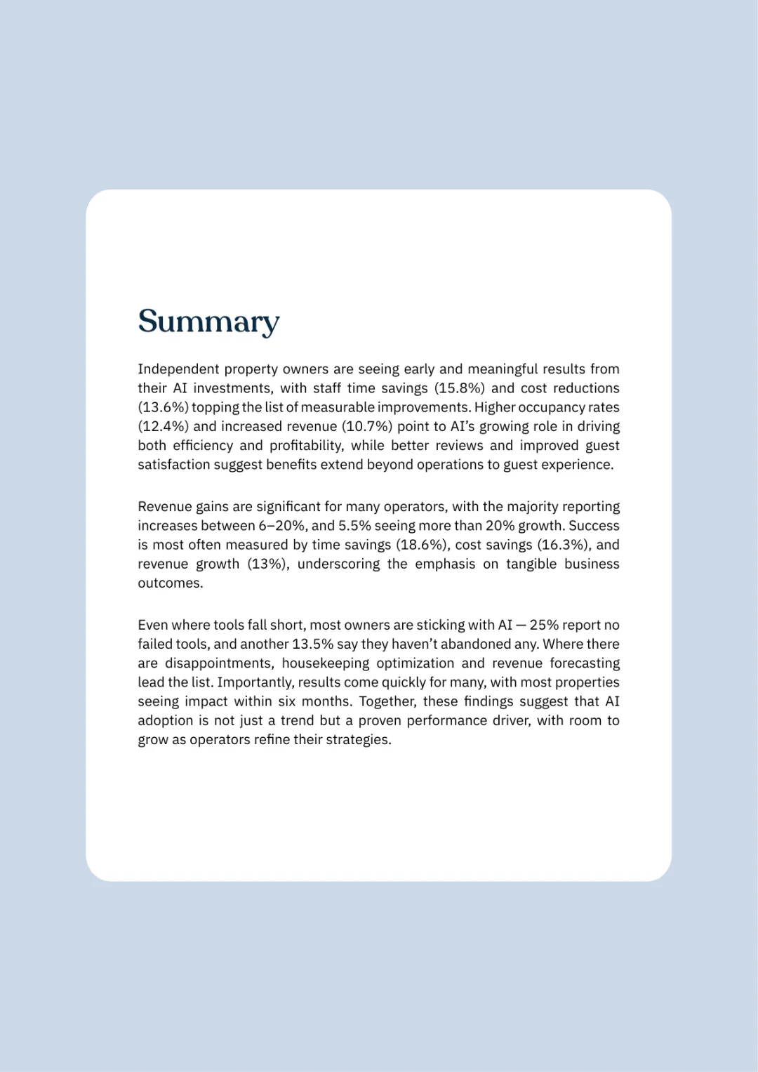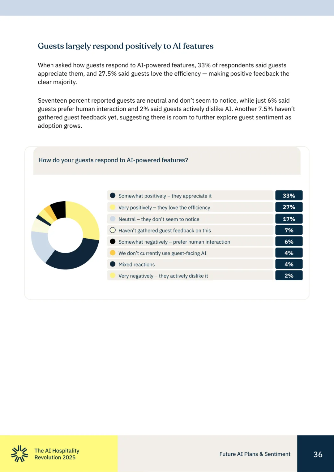导读:2025 年酒店业人工智能革命研究报告基于对 200 名独立住宿业态经营者的调研,展现了 AI 在行业的落地现状与发展趋势。调研对象涵盖度假租赁、民宿、精品酒店等多种类型,超七成经营者使用 AI 不足两年,行业整体处于 AI 应用初期。AI 在客群沟通、营销推广、社媒运营等客面场景应用最广泛,节省时间与提升效率是经营者引入 AI 的核心动因,自动化客群沟通也成为创造价值最高的 AI 应用方向,超七成经营者表示 AI 效果达到或超出预期,员工对 AI 工具的接受度也处于较高水平。行业在 AI 落地中仍面临技术专业度不足、员工培训难度大、系统融合不畅等问题,经营者也担忧技术会削弱服务的人文属性,同时对数据安全存在顾虑。不过 AI 已为行业带来切实回报,超八成经营者实现营收增长,且多数能在半年内看到应用效果。未来经营者计划重点布局智能能源管理、客群沟通自动化等领域,近七成认为 AI 是保持竞争力的关键,行业对 AI 的整体预期积极,多数预判五年内超半数独立住宿业态将实现 AI 化运营。